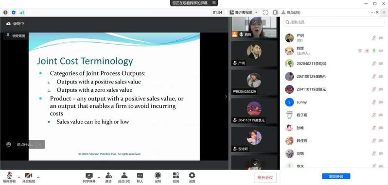 此次教学观摩和研讨活动主要分为两个环节:一是项目组教师观摩王辉老师《Cost & Management Accounting》一课的在线教学;二是项目组教师交流观摩感悟以及自身在教学中遇到的问题,集思广益,共同研讨,形成有效的解决方案,以推动CMA项目教学水平的高质量发展。