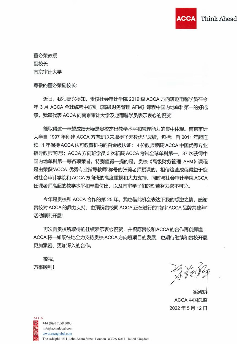 近日,公司收到ACCA中国总监梁淑屏女士发来的贺信。云顶国际yd222线路检测中心2019级ACCA班赵雨馨同学在今年三月ACCA全球统考中获得《高级财务管理 AFM》中国内地单科第一的好成绩。截至目前,公司ACCA学子在全球统考中,已有3人获得单科成绩全球第一、38人次获得中国内地第一。