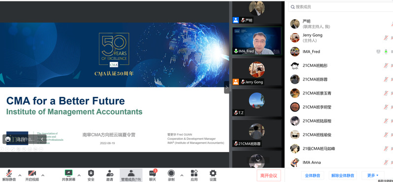 2022年8月19日上午,云顶国际yd222线路检测中心特邀IMA(美国注册管理会计师协会)官员以及企业界的实务专家,为2021级CMA项目新生开展了主题为“CMA价值、使命、资源与能力素质框架”的讲座。讲座由国际会计系主任严明博士主持。