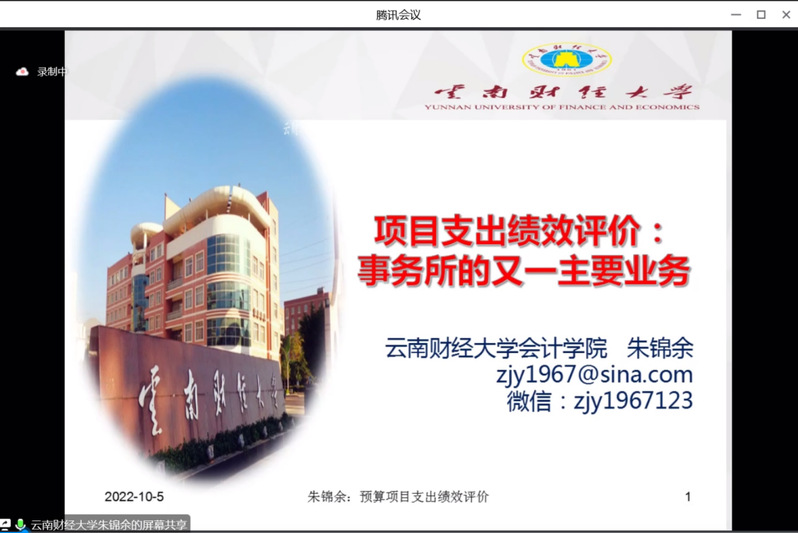 2022年10月5日下午,云南财经大学二级教授、博士生导师朱锦余教授做客社会审计学术论坛第9期,开展主题为“项目支出绩效评价:会计师事务所的又一主要业务”的专题讲座。本次学术论坛由公司副经理叶邦银主持,通过腾讯会议进行,公司全体师生及兄弟高校老师近300余人在线参会。