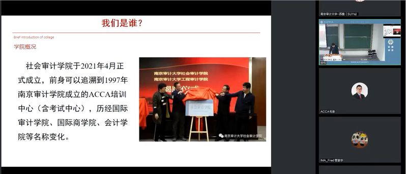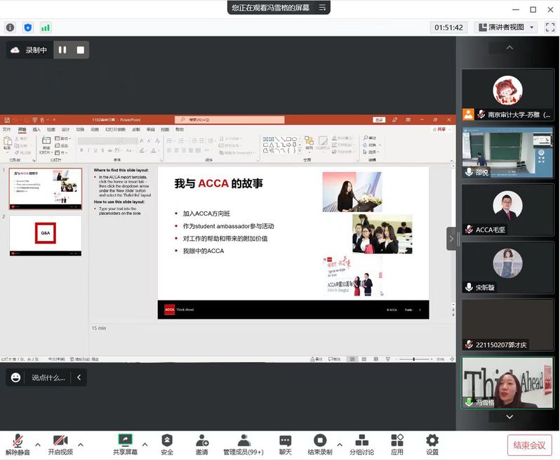 ACCA资深会员代表南京世茂滨江希尔顿酒店的总会计师冯雪格女士以其自身发展经历为例,围绕“加入ACCA方向班”、“作为student ambassador参与活动”、“对工作的帮助和带来的附加价值”以及“我眼中的ACCA”四个方面讲述了她与ACCA的故事。