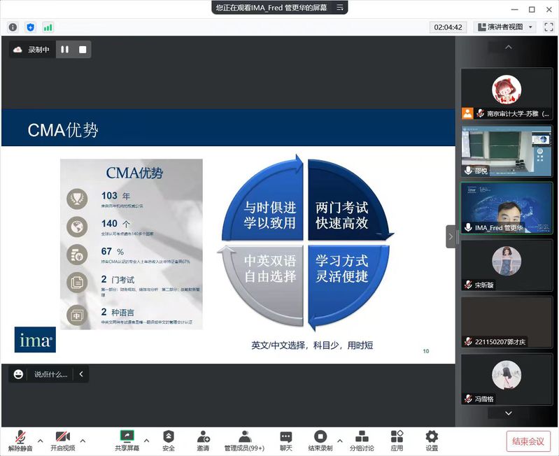 IMA(美国管理会计师协会)华东区合作发展经理管更华先生进行了题为《CMA助力更好的人生发展》的分享,他从IMA管理会计师协会、财务会计与管理会计区别、支持资源、持续教育等方面对CMA进行了详细介绍。