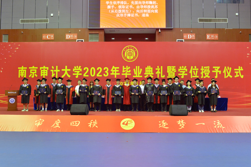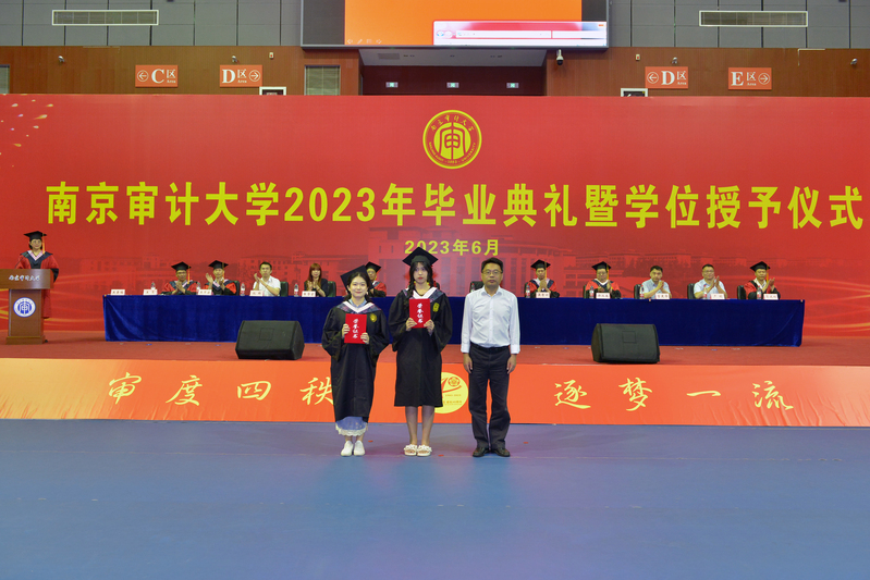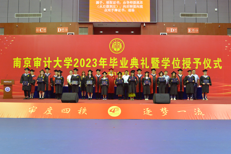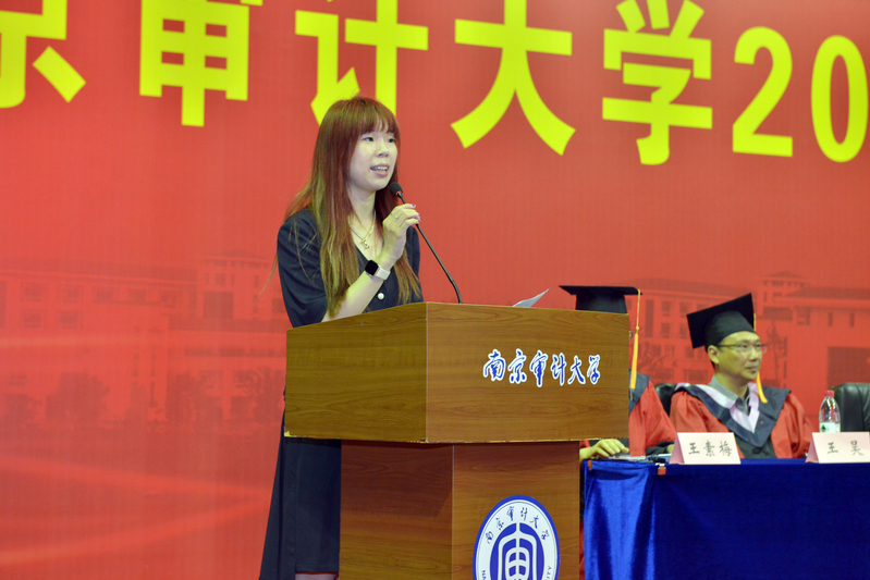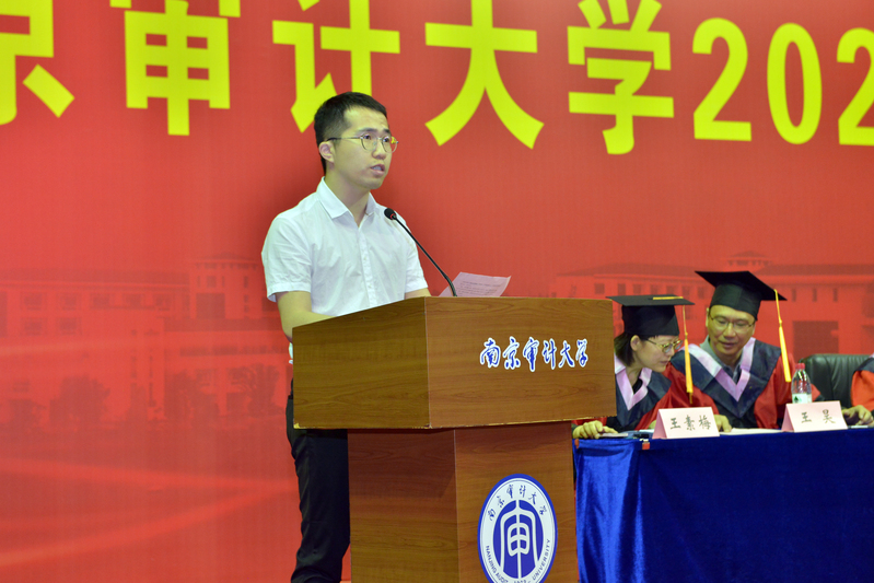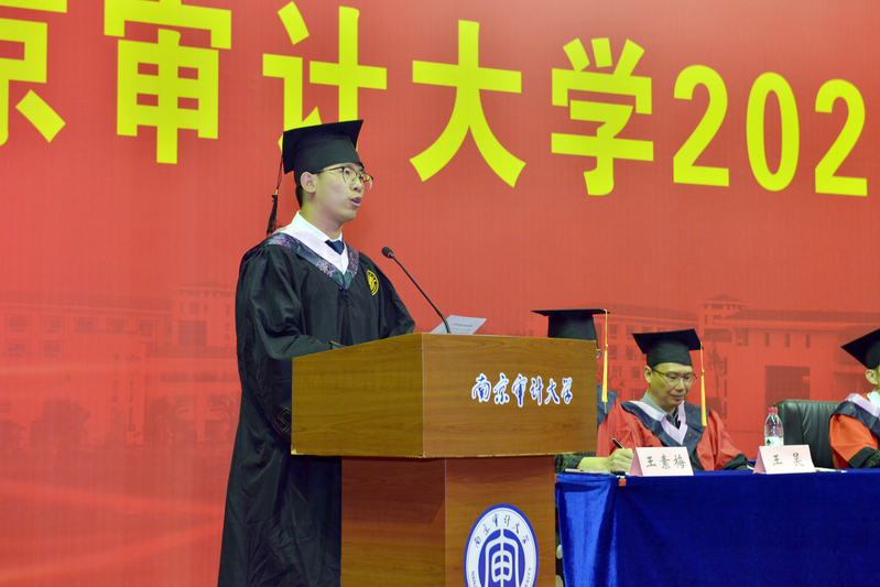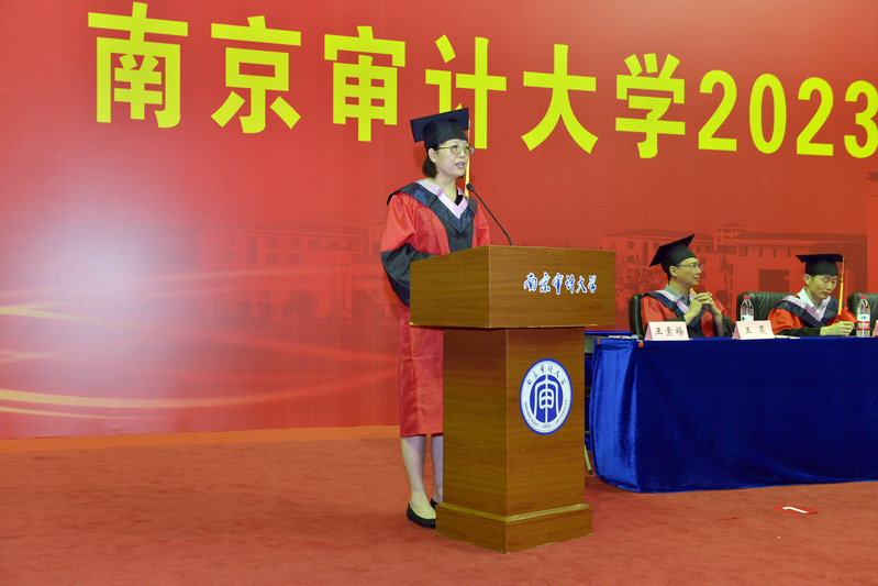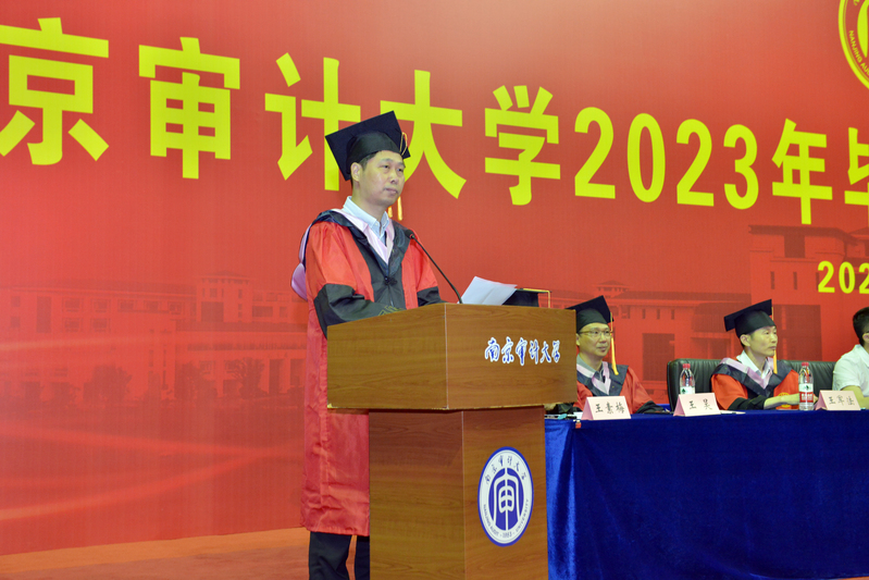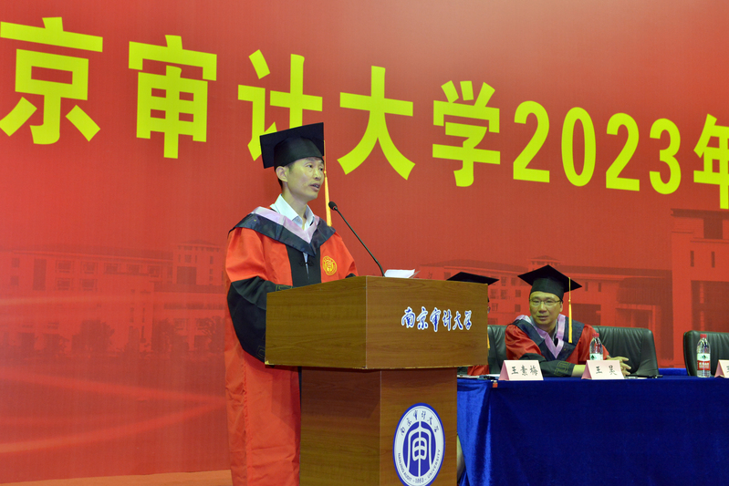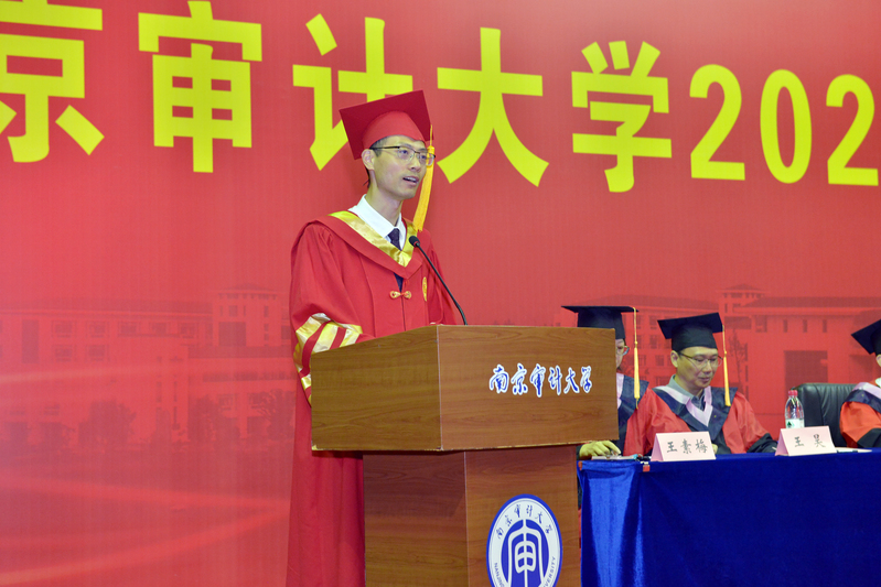 陈骏致辞。他例举了牛钰顽强拼搏的事迹,讲述了审大员工史程十余载为恩师蒋志芬送花的故事,勉励毕业生们勇敢拼搏,饮水思源并能终身持续学习,为理想和事业不竭奋斗!