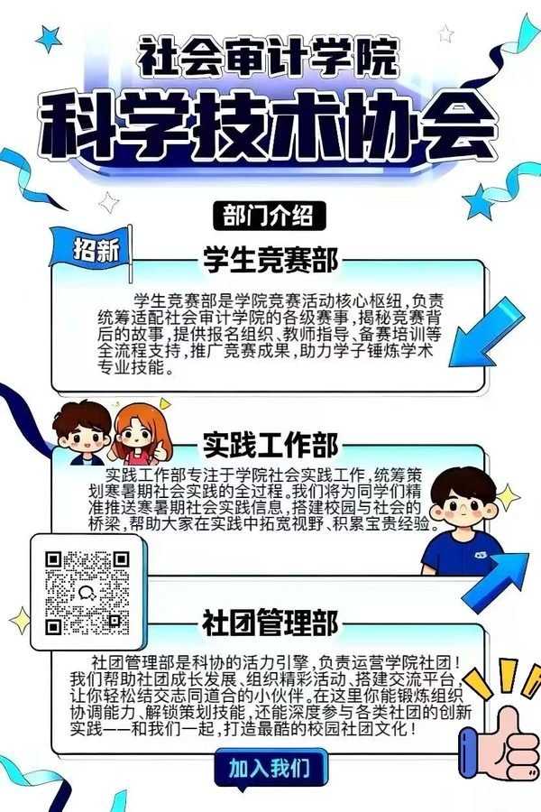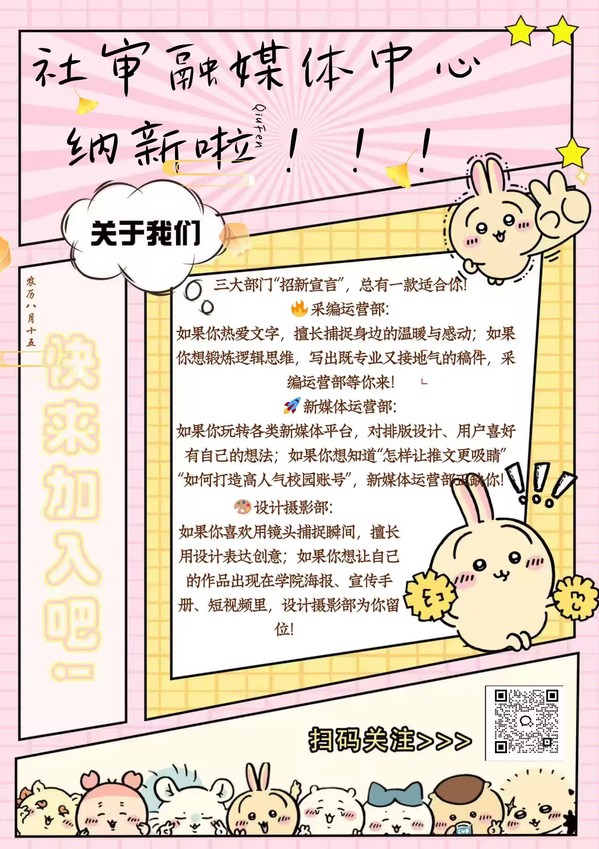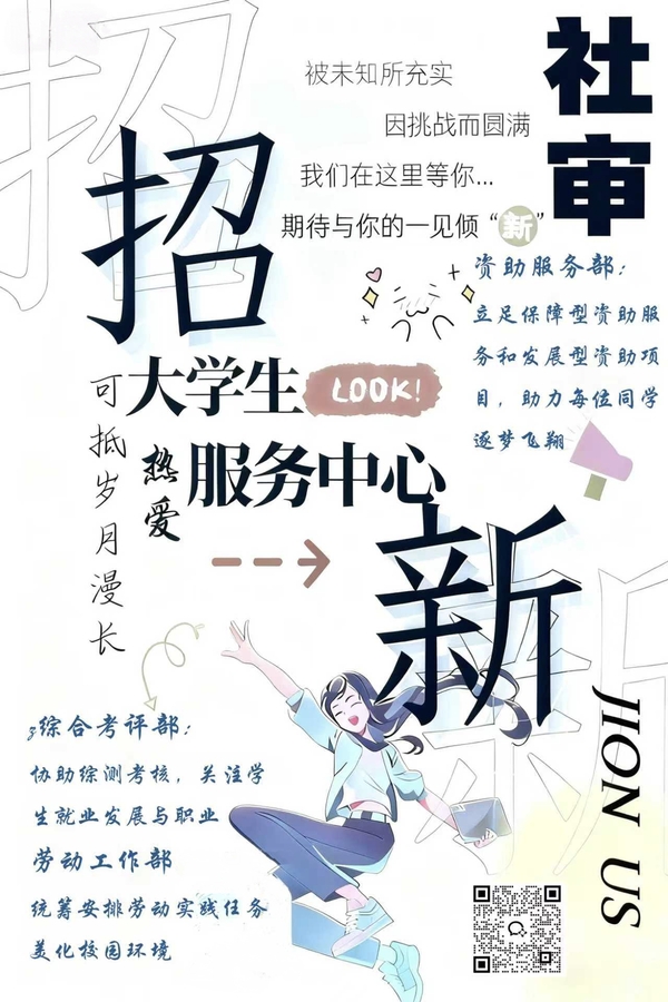 青春从不缺少可能,缺的是敢于迈出的脚步;成长从不是孤军奋战,而是与同频伙伴并肩同行。社审团学组织的每一个部门,都为怀揣热爱的你预留了位置,每一项活动,都期待你的策划与参与!现在,找到你心动的组织,扫描对应的招新二维码加入专属群聊,解锁组织详情、报名流程与更多独家资讯。别让犹豫错过精彩,快来这里与志同道合的伙伴相遇,让大学时光因参与而充实,让青春因奋斗而闪耀!我们在云顶国际yd222线路检测中心团学组织,等你来!