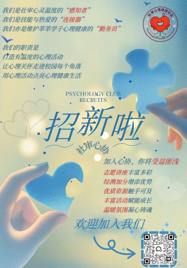 我们是社审心灵温度的“感知者”,用细腻洞察传递关怀;我们是技能与热爱的“连接器”,在各项精彩纷呈的心理活动中,让干货与热忱双向奔赴;我们是心理委员的“成长搭子”,助力夯实心理工作硬功底。与一群把“温暖”当底色的伙伴同行——用新视角挖掘心理工作的趣味,以新创意探索心灵守护的路径,借新协作碰撞灵魂的共鸣。