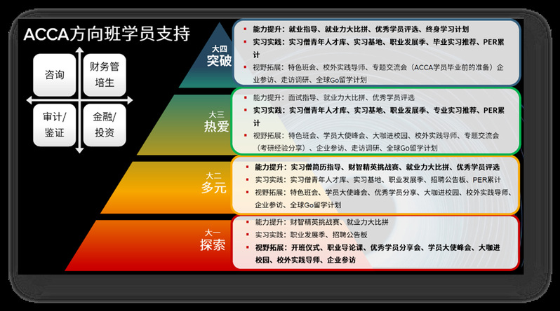 公司依托2个国家级一流本科专业建设点:审计学、会计学,设置了审计学(ACCA方向)、审计学(创新基地班)、会计学(CMA方向)等特色专业,供大家考入南审后,提供多元化的选择,构建了“国际化视野、学术化拓展、产业化延伸”三位一体的本科人才培养体系,向社会输出懂国际规则、会调查研究、能实践操作的复合型创新人才。